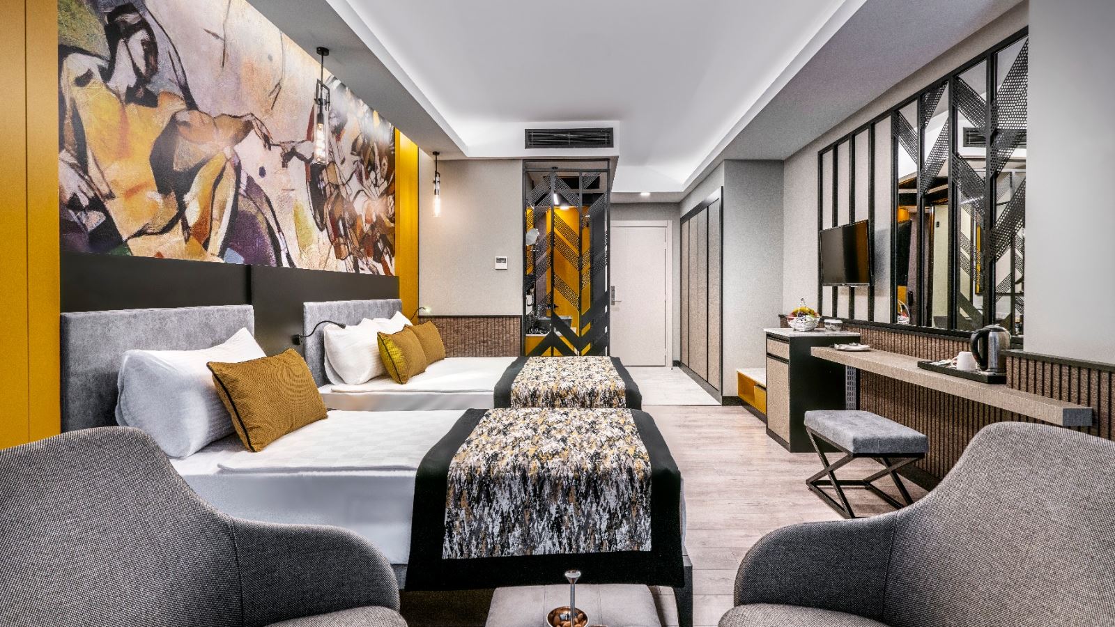 Family Room | Kokku tube: 57 Toa suurus: 58 ruutmeetrit 2 magamistuba (Ülisuur kaheinimesevoodi: 1, Kaks üheinimesevoodit: 2) Uks Vannitoad: 1 (Dušš) WC-d: 1 Rõdu Linnavaade, Küljelt merevaade, Basseinipoolne, Basseinivaade Õhukonditsioneer (töötab perioodil: Juuni, Juuli, August, September) TV, kanalid: Inglise Tee või kohvi võimalus Minibaar toas (Igapäevane; jaoks "Ultra All Inclusive" Tasuta) Juhtmevaba/internett (Tasuta) Seif toas (Tasuta) Laminaat Igapäevane Telefon Toad asuvad korrustel: 1,2,3,4,5,6 Maksimaalne täituvus: Täiskasvanutest kuni 4, lapsed kuni 3; Inimesi kokku: kuni 5 |
