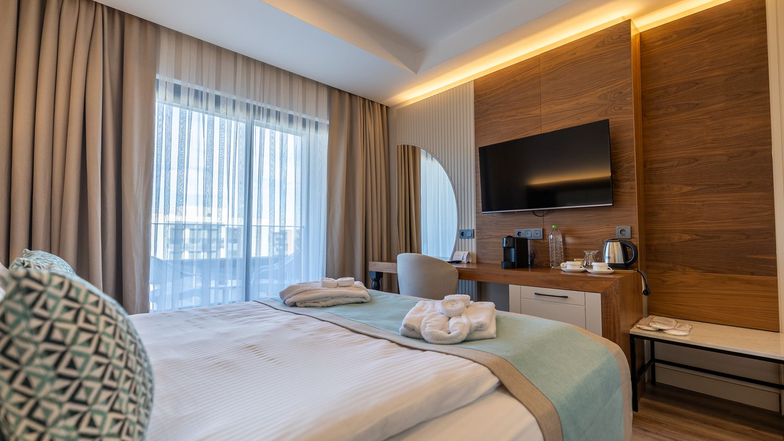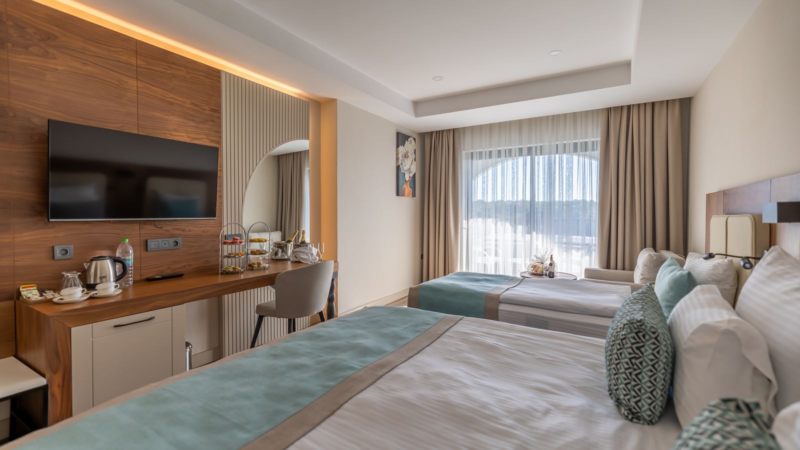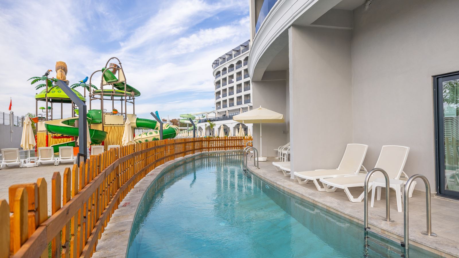 Standart Room Pool Side With Jacuzzi | Kokku tube: 11 Toa suurus: 28 - 31 ruutmeetrit 1 magamistuba (Ülisuur kaheinimesevoodi: 1, Kaks üheinimesevoodit: 1) Vannitoad: 1 (Dušš, Jacuzzi) WC-d: 1 Rõdu Basseinipoolne Õhukonditsioneer (töötab perioodil: aastaringselt, 24 tundi) TV, kanalid: Inglise Tee või kohvi võimalus Minibaar toas (Igapäevane; jaoks "Ultra All Inclusive" Tasuta) Juhtmevaba/internett (Tasuta) Seif toas (Tasuta) Laminaat Igapäevane Telefon Toad asuvad korrustel: 6 Lisavoodi: Kokkupandav Maksimaalne täituvus: Täiskasvanutest kuni 3, lapsed kuni 1; Inimesi kokku: kuni 4 |