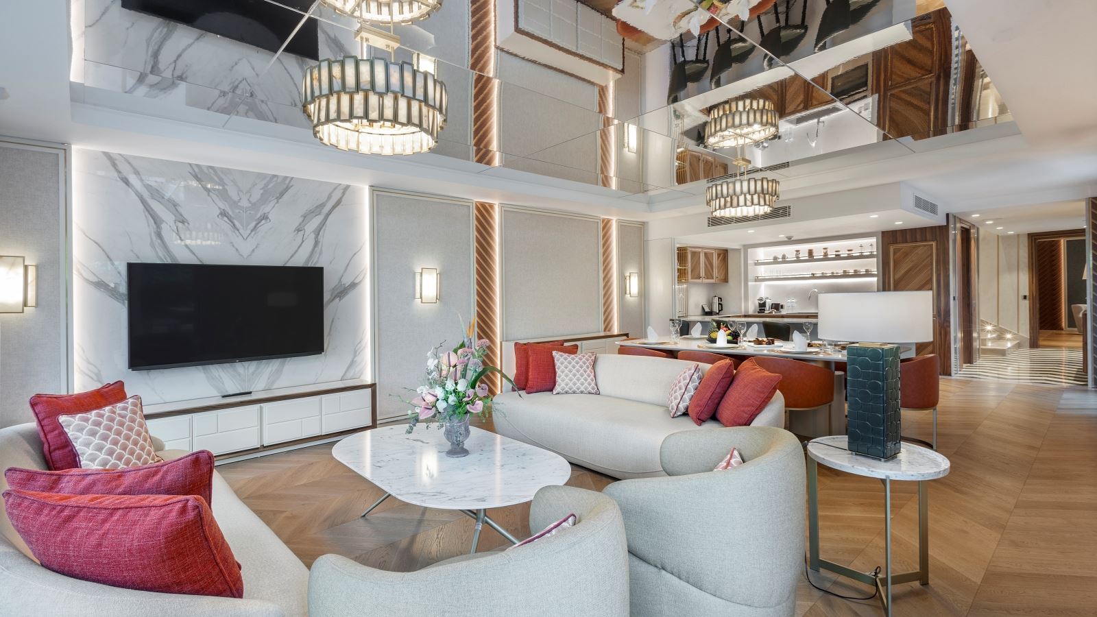 Prestige Suite Sea View | Kokku tube: 1 Toa suurus: 375 ruutmeetrit Elutuba, Söögikoht, Kööginurk, Riidekapiga tuba, Töökoht 2 magamistuba (Ülisuur kaheinimesevoodi: 1, Kaks üheinimesevoodit: 2) Uks Vannitoad: 2 (Vann, Dušš, Jacuzzi) WC-d: 3 Balcony and Terrace Korruseid toas: 2; esimene korrus: Elutuba, Kööginurk, WC, Töökoht, Söögikoht, Rõdu; teine korrus: Magamistuba: 2, Vannituba: 2, WC: 2, Jacuzzi, Terrass, Rõdu Merevaade Õhukonditsioneer (töötab perioodil: aastaringselt) TV, kanalid: Inglise Tee või kohvi võimalus Minibaar toas (Igapäevane; jaoks "Ultra All Inclusive" Tasuta) Juhtmevaba/internett (Tasuta) Seif toas (Tasuta) Laminaat Igapäevane Telefon Mikrolaineahi Käruteenus Lillede ja puuvilja teenus (Saabumisel) Ülemteener (Tasuta) Toad asuvad korrustel: 5 Lisavoodi: Kokkupandav Maksimaalne täituvus: Täiskasvanutest kuni 5, lapsed kuni 1; Inimesi kokku: kuni 6 |