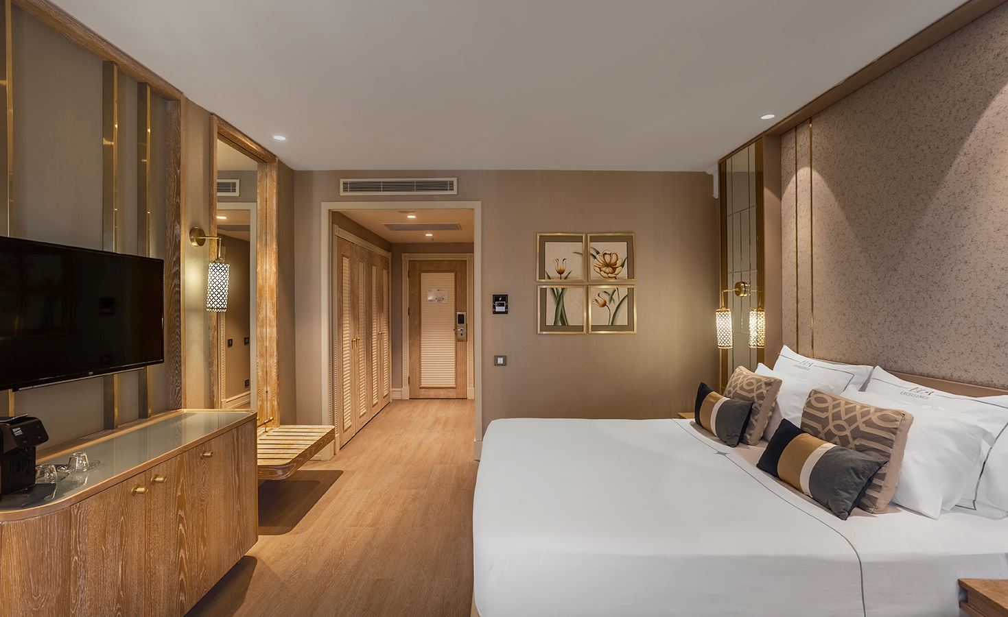 Deluxe Suite | Kokku tube: 9 Toa suurus: 105 ruutmeetrit Elutuba 1 magamistuba (Ülisuur kaheinimesevoodi: 1) Uks Vannitoad: 1 (Dušš, Jacuzzi) WC-d: 1 Rõdu Merevaade Õhukonditsioneer (töötab perioodil: aastaringselt) TV, kanalid: Inglise Tee või kohvi võimalus Minibaar toas (Igapäevane; jaoks "Ultra All Inclusive" Tasuta) Juhtmevaba/internett (Tasuta) Seif toas (Tasuta) Laminaat Igapäevane Telefon Lillede ja puuvilja teenus (Saabumisel) Toad asuvad korrustel: 1,2,3,4 Lisavoodi: Kokkupandav Maksimaalne täituvus: Täiskasvanutest kuni 2, lapsed kuni 2; Inimesi kokku: kuni 4 |