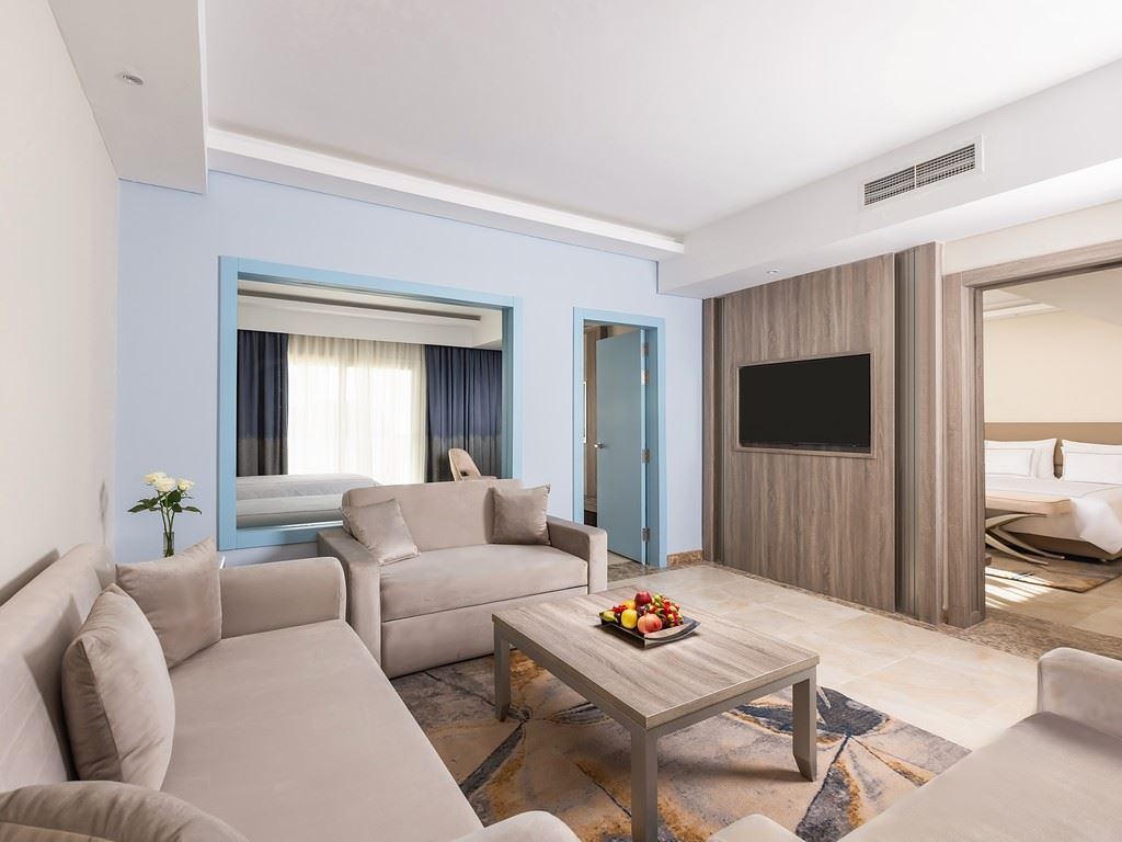 | Royal Suite Beach Side | Kokku tube: 2 Toa suurus: 185 ruutmeetrit Kööginurk 2 magamistuba (Ülisuur kaheinimesevoodi: 1, Kaks üheinimesevoodit: 2) Uks Vannitoad: 2 (Vannituba või dušš) WC-d: 2 Rõdu või terrass: rõdud 1, terrassid 1 Aia vaade, Basseinipoolne Individuaalne (Tasuta) TV, kanalid: Inglise Tee või kohvi võimalus Minibaar toas (Igapäevane; jaoks "Ultra All Inclusive" Tasuta) Juhtmevaba/internett (Tasuta) Seif toas (Tasuta) Keraamika Igapäevane Telefon Toad asuvad korrustel: 1,2,3 Lisavoodi: Sohvavoodi Maksimaalne täituvus: Täiskasvanutest kuni 4, lapsed kuni 2; Inimesi kokku: kuni 6 |